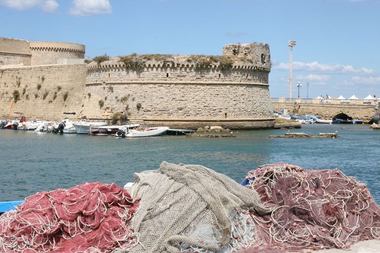 La ville d’environ 21 000 âmes a gardé une forteresse du XIIIe d’origine angevine. Le centre historique, situé sur une île, conserve des ruelles typiques des Pouilles, avec une cathédrale baroque du XVIIe, une fontaine grecque du XVIe et bien d’autres intéressants monuments.