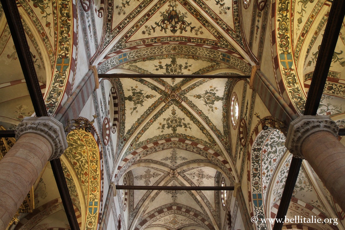 L’interno con le sue tre navate coperte da volte a crociera è maestoso, la cui navata centrale è sostenuta da 12 potenti colonne in marmo bianco e rosso di Verona con capitelli gotici.